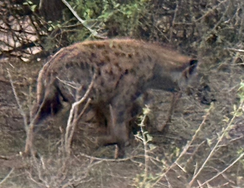 We had two spottings of hyenas during our travel. One late at night and another during the day. Observing the hyena during the day, we were able to see how long the front legs were compared to the back legs that give them the lopsided gait. Strange to see asymmetric limbs on a single animals and it was a wonder to watch them scramble back into the brush for cover.