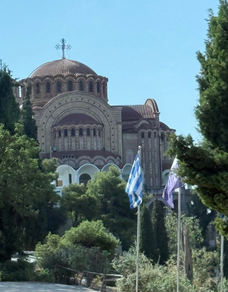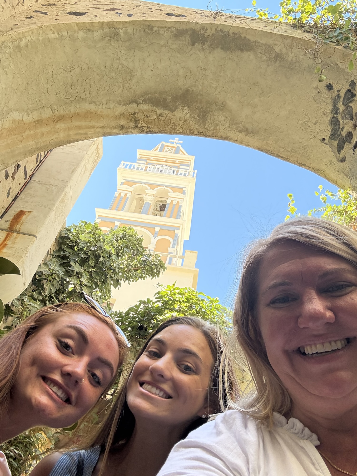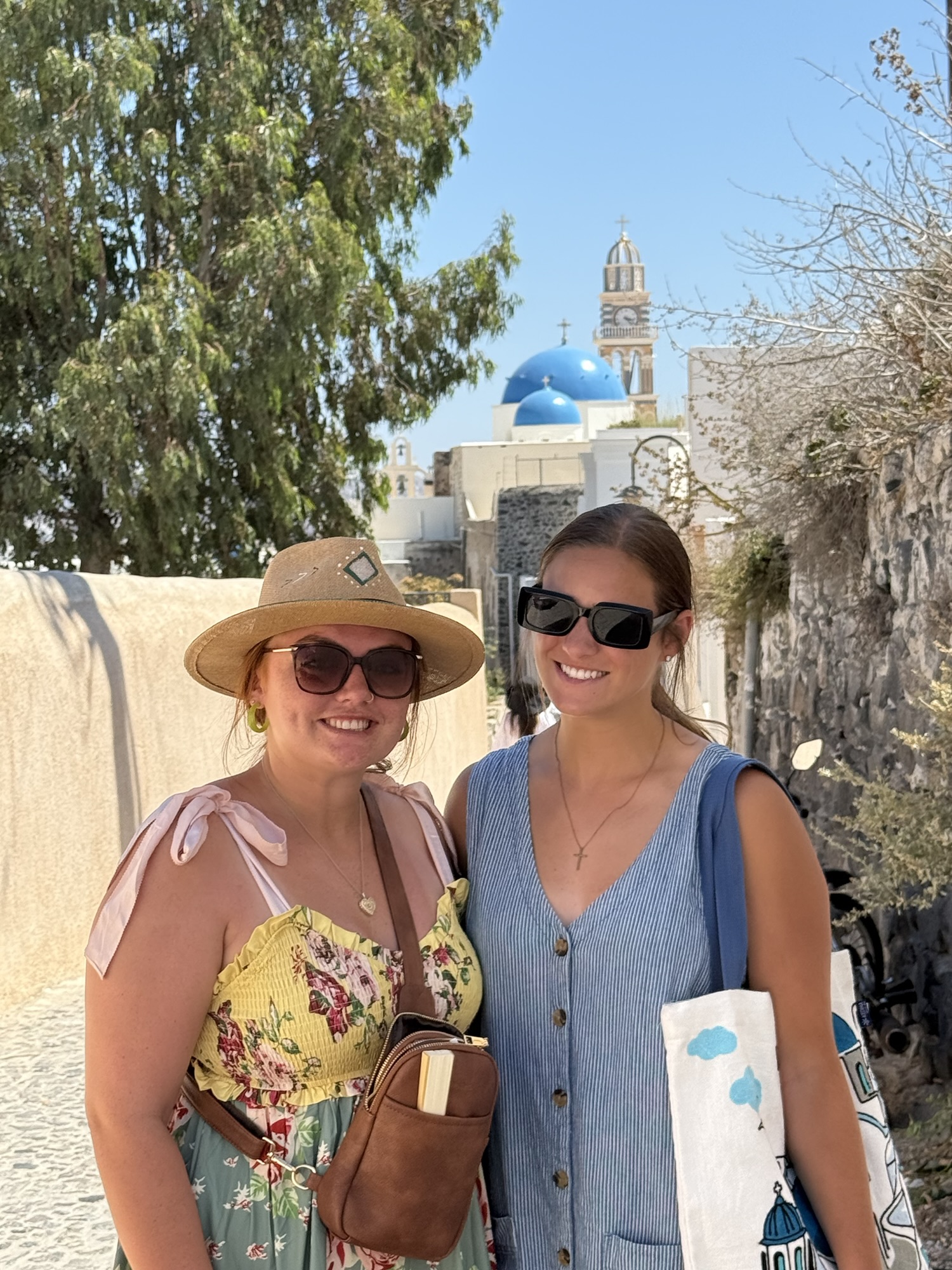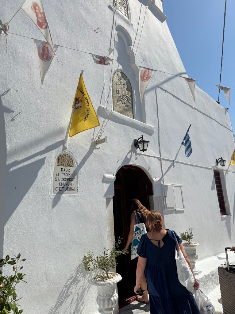 Greek adventure started from Athens and the first stop Santorini. After a swift cable ride up the volcanic cliffs we ventured into the dazzling white buildings of Fira. Fascinated with the shopping and selecting unique souvenirs. We searched out the blue dome church (St John the Baptist Cathedral) finding artist shops along they way. Overhearing the blue domes were in Oia and jumped into a taxi bus to that town. Friendly locals provided directions to see the blue domes and celebrated the beautiful island with lunch on the rooftop. Cheers to a beautiful amazing island!