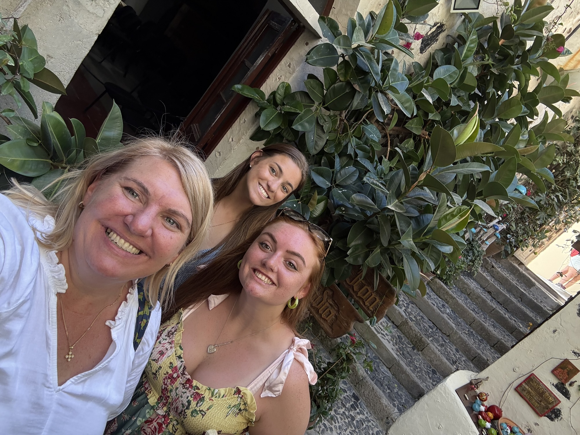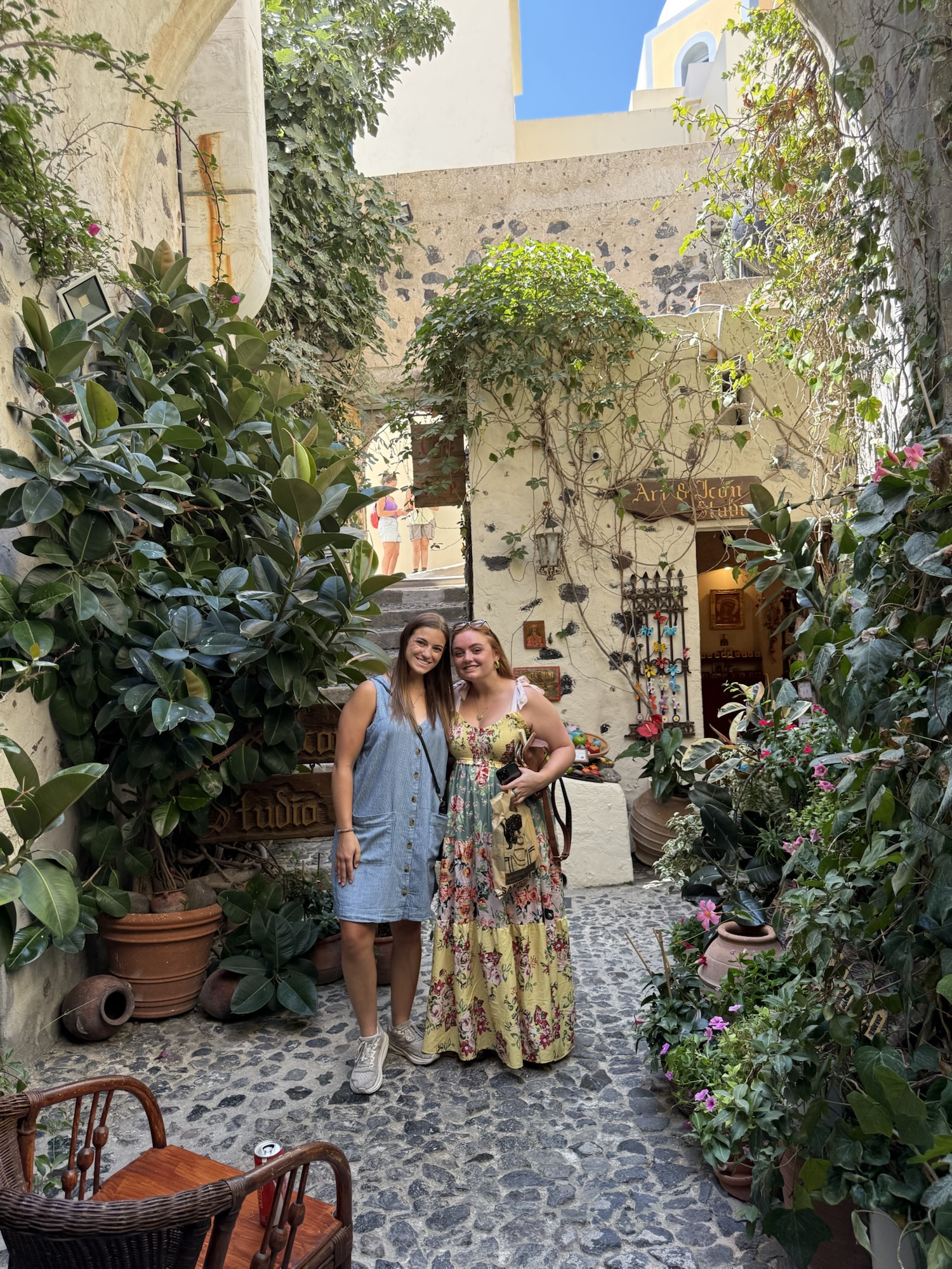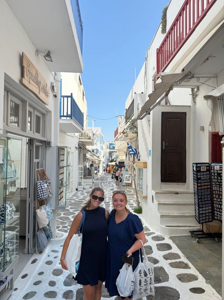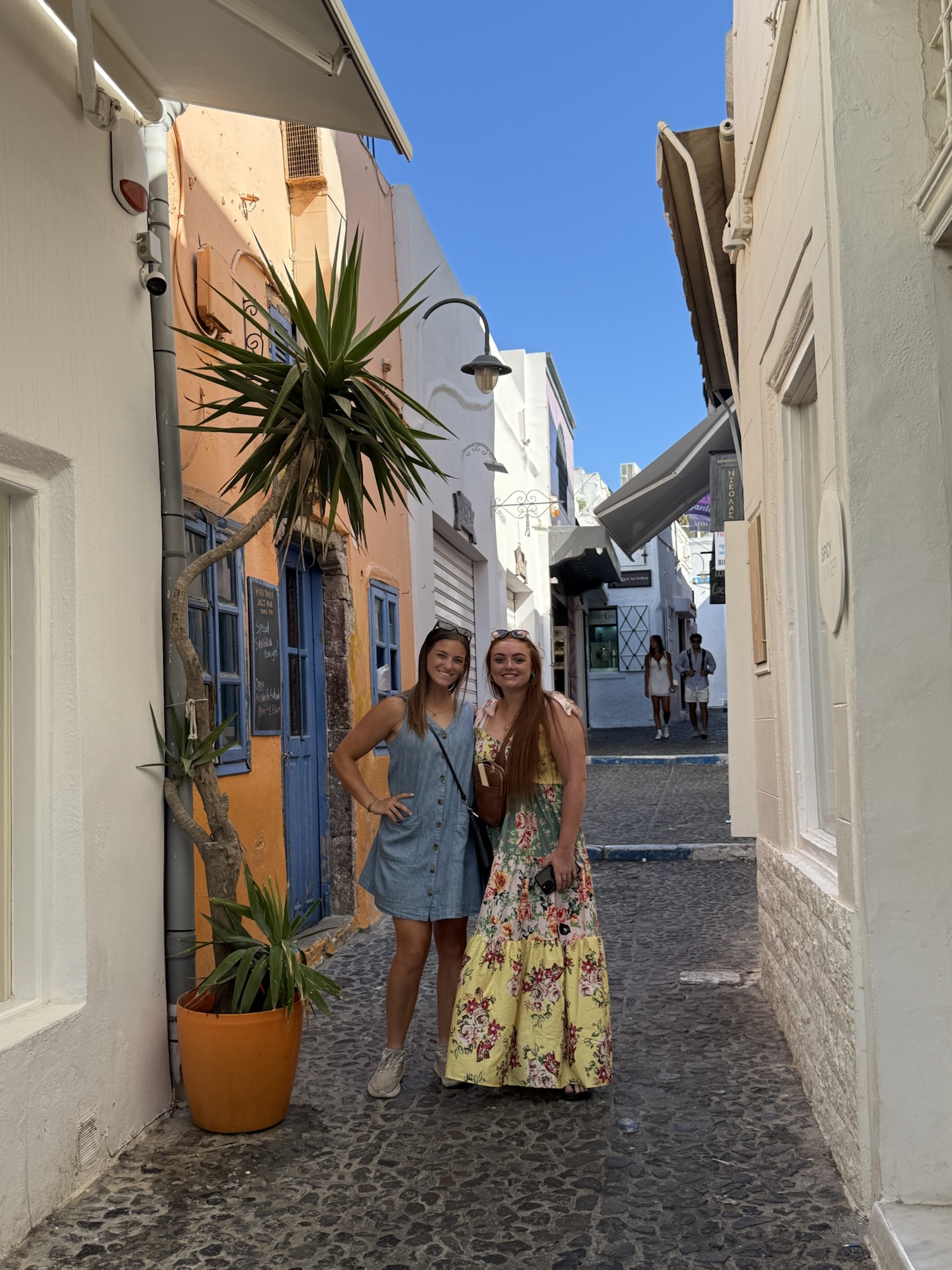 Greek adventure started from Athens and the first stop Santorini. After a swift cable ride up the volcanic cliffs we ventured into the dazzling white buildings of Fira. Fascinated with the shopping and selecting unique souvenirs. We searched out the blue dome church (St John the Baptist Cathedral) finding artist shops along they way. Overhearing the blue domes were in Oia and jumped into a taxi bus to that town. Friendly locals provided directions to see the blue domes and celebrated the beautiful island with lunch on the rooftop. Cheers to a beautiful amazing island!